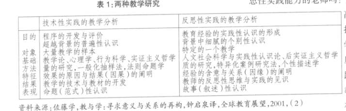 表1中指向“技术性实践”的“教学科学”探讨课堂教学中通用的技术原理,对效果侧重量化的评估,适合大规模的集体教学;“反思性教学”则探讨某种教室的事件和某种方法的意义,探讨某教室与某学生的活动与经验的意义,对效果侧重定性评估,适合个别或小群体的教学(佐藤学,2001)。(教育论文 fanwen.oyaya.net)佐藤学( 2001)认为,教师对“技术性实践”的需求,“决不是无根据、无意义的”,尽管饱受质疑,“但未完全丧失它的意义”,因为,目前学校教育制度仍被视为技术性体系加以组织,仍在试图“开发有效的教学系统与开发普遍的教材程序”,因而,“旨在‘技术性实践’的教学与教学研究的有效性并不会减弱”。