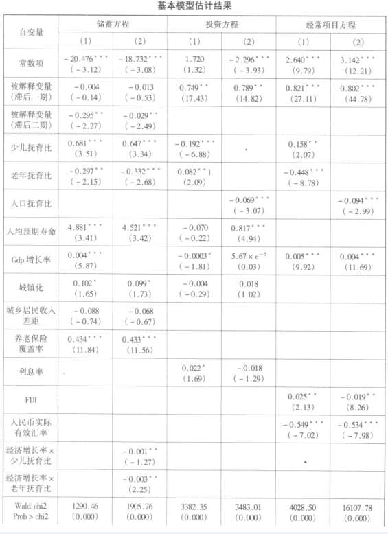 1.人口抚育负担对储蓄存在显著影响,且在1%显著性水平上通过了检验,少儿人口比重增加时,居民储蓄率不减反增,似乎有悖于经典的LC - PH假说。笔者以为其主要原因有二:第一,古典经济学过于强调劳动供给的外生性,认为劳动供给固定不变,后来的真实经济周期理论(RBC)对此进行了修正,认为工作与闲暇之际存在替代关系,当家庭中的收入减少或者负担增加时他们可能选择增加劳动供给,以维持一个不变的储蓄率。第二,家庭中少儿人口增加后,其需求结构出现调整,支出重心由一般的生活必需品转向教育,支出的时间模式亦将后移。所以当期少儿人口比重的增加,意味着家庭在未来将有一笔数额较大的教育支出,家庭由此选择削减当期消费,以满足未来支出需要,从这一点来看,它又恰恰吻合了生命周期理论的内涵。少儿人口抚育负担与投资之间存在负相关关系,由于少儿人口的增加,劳动适龄人口的相对减少,与之相配套的物质资本投资萎缩。经常项目余额作为国内储蓄投资的缺口,当少儿人口年龄结构的变化引起了高储蓄,而投资又不足以吸收时,经常项目呈现顺差。