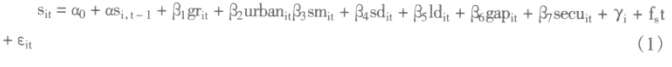 根据理论分析和现有的实证文献,本文将解释变量分解为二类:第一类是共同变量,即对储蓄、投资和经常项目均存在影响,主要包括少儿人口抚育比(sd)、老年人口抚育比(ld)、人均预期寿命(sm)、经济增长率(g)、城镇化(urhan);第二类是特定变量,即只影响储蓄、投资和经常项目中的某一个,其中储蓄方程中引入了养老保险制度转轨( secu)和城乡居民收入差距(dis),投资方程中引入了利息率(inest),经常项目余额方程中引入了外商直接投资(fdi)和人民币实际汇率(reer)。此外,在储蓄方程中引入了经济增长率和人口抚育负担的交互项,实证检验的方程形式具体如(8)、(9)、(10)式,其中下标i表示地区、下标t表示年份,s为居民储蓄率,打Ⅳ为投资率、x为经常项目,1al<l为滞后内生变量的待估参数,γi和‘分别代表非观测的地区和时间特定效应,εit表示随机扰动项,E(Xitεit,E(yi) =E (εit)=E(γiεit)=0,Xiit代表解释变量的向量集。