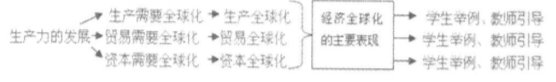老师引导学生回顾总结经济全球化的三个主要表现及关系。以上就是经济全球化的三个主要表现。生产全球化是贸易全球化和资本全球化的基础,贸易全球化、资本全球化又进一步促进生产全球化。