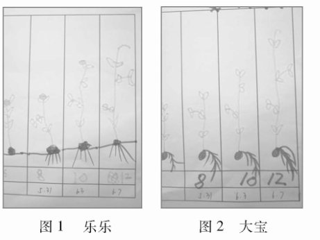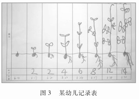 这一次水培豌豆芽的周期相对土培短些,根的变化孩子们都能清晰地观察到,而且都能主动有序做观察记录。图3就是幼儿记录的情况。
